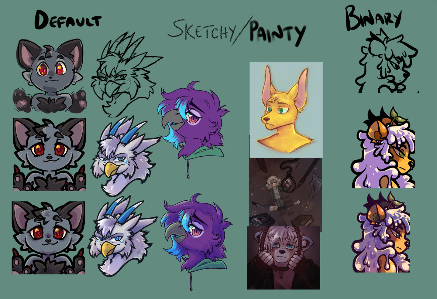 These are examples of work drawn with a binary brush, aka hard pixels. Working on getting examples of other styles ready!For now, consult the below image + gallery to see some various examples.